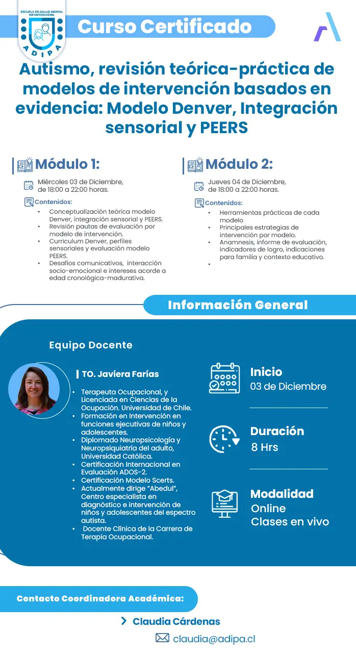 Este curso se enmarca en la necesidad de brindar a los profesionales herramientas teórico-prácticas que les permitan comprender y aplicar principios fundamentales de estos modelos en su práctica clínica y educativa., no obstante es relevante considerar que la revisión será con un énfasis a las herramientas y la esencia de cada modelo, sin embargo, es importante mencionar que para aplicar el modelo Denver y modelo PEERS es necesaria la acreditación oficial asociada.