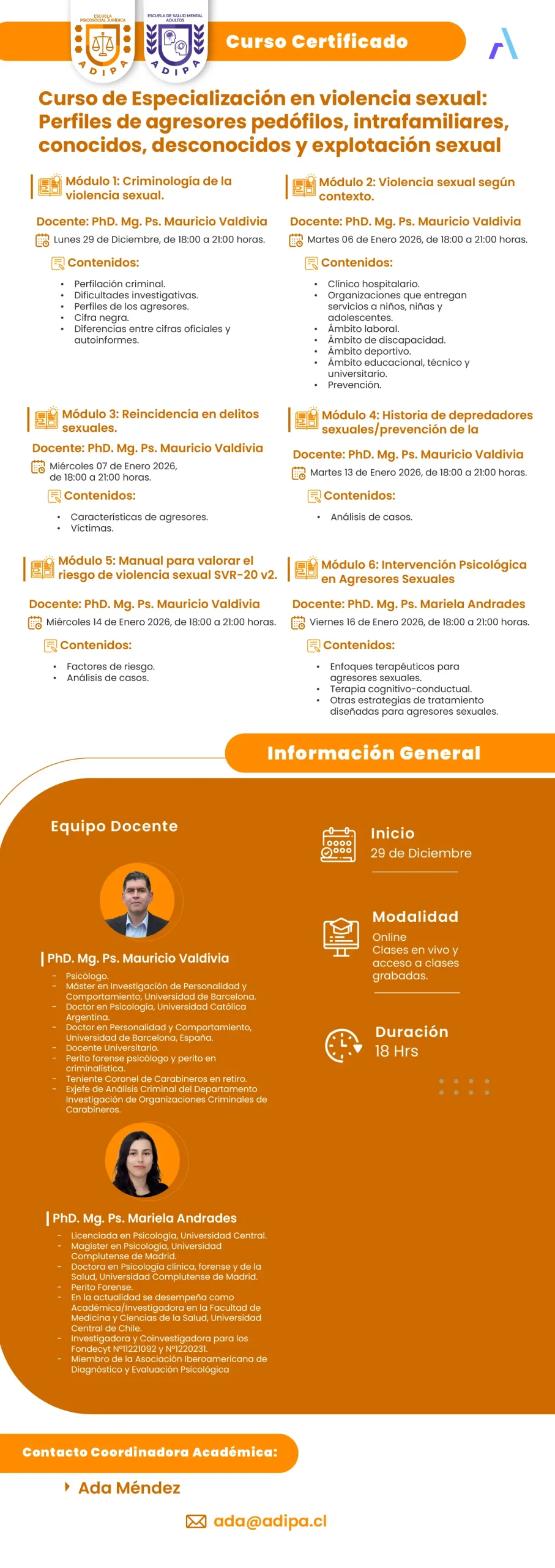 Curso de Especialización en violencia sexual: Perfiles de agresores pedófilos, intrafamiliares, conocidos, desconocidos y explotación sexual - Adipa