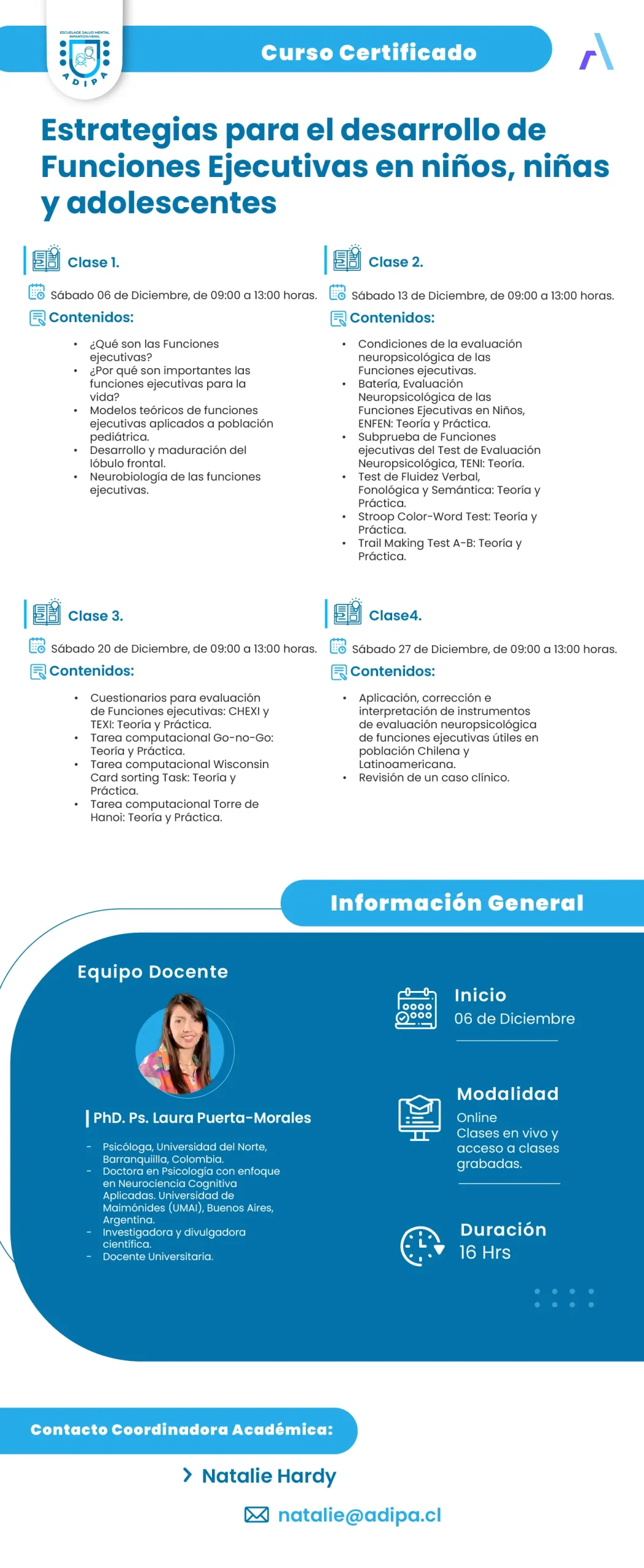 Dirigido a: Este curso está dirigido a profesional del área de la Salud Mental y educación tales como Psicólogos, Neuropsicólogos, Educadores Diferenciales, Psicopedagogos y docentes. A su vez, este curso es recomendado para estudiantes de último año de las carreras antes mencionadas, interesados en la temática.
