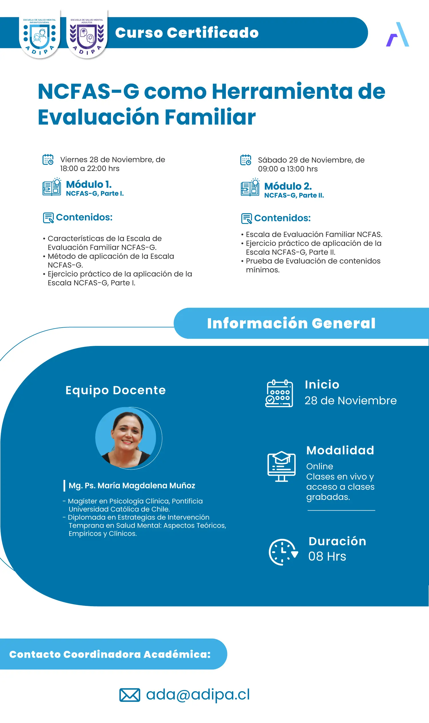 Al terminar el programa con una duración de 8 horas recibirás la certificación del curso, NCFAS-G como Herramienta de Evaluación Familiar, acreditado por SENCE.