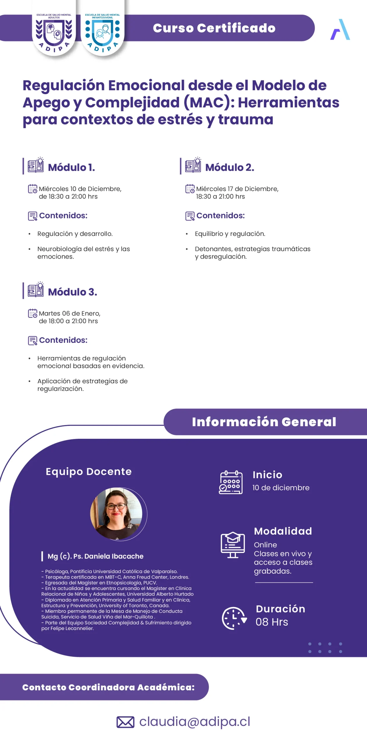 Al terminar el programa con una duración de 8 horas recibirás la certificación del curso, Regulación Emocional desde el Modelo de Apego y Complejidad (MAC): Herramientas para contextos de estrés y trauma, acreditado por SENCE.
