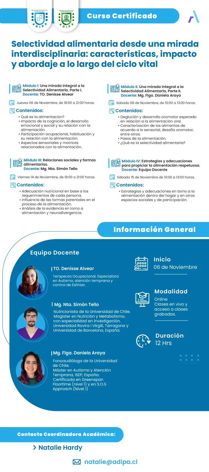 A lo largo del ciclo vital, los cambios en las preferencias alimentarias no solo responden a factores biológicos, sino también a experiencias personales, cultura y relaciones interpersonales. Este curso busca capacitar a profesionales de la salud y la educación para que comprendan, desde un enfoque integral y humano, cómo abordar la selectividad alimentaria, adaptando las intervenciones a las necesidades y realidades de cada persona, respetando sus ritmos y particularidades.